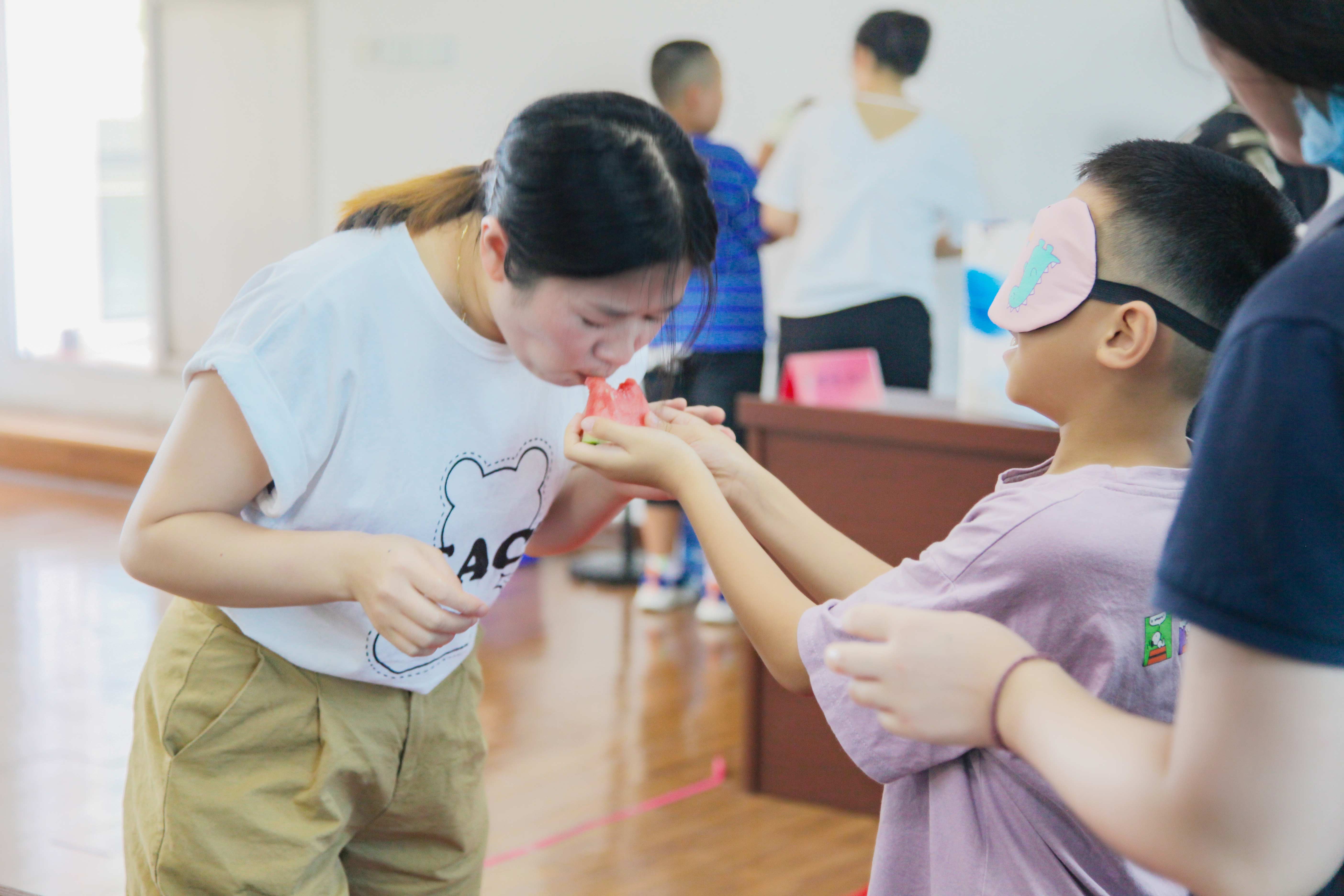 “蒙眼吃西瓜”游戲輕松快樂,孩子們蒙著眼睛,憑感覺尋找父母嘴巴的位置,并喂食西瓜,這項游戲很好地增進了親子之間的感情。